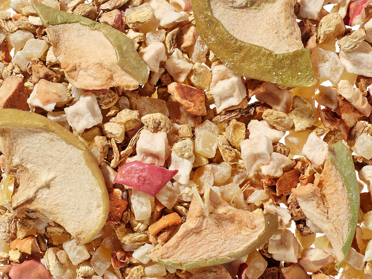 Eine besondere Mischung, die nicht weiter nachgezuckert werden muss. Als Hauptbestandteil verwenden wir kandierte Ingwerstücke. Deren bekannte und beliebte Note von süßer, scharfer Ingwerwurzel in Kombination mit getrocknetem Ingwer und dreierlei Apfelstücken ergeben einen leichten, süßen und würzigen Teeaufguss mit entsprechenden Aromanoten.