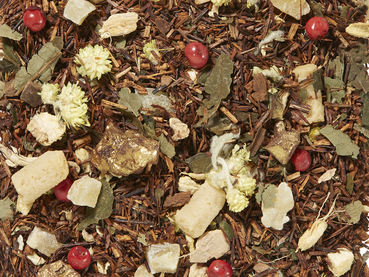 Genießen Sie den Geschmack frisch gebackener Ingwerplätzchen in Kombination mit hochwertigem Rotbuschtee. Würziger Ingwer sorgt für eine angenehme Schärfe, während süße Brombeerblätter eine harmonische Süße hinzufügen und durch angenehme Gebäck-Noten abgerundet werden. Rosa Pfefferkörner, zarte Marzipanstücke und leuchtende Katzenpfötchen verleihen der Mischung eine ansprechende Optik. Absolutes Highlight: glitzernde Zuckerstücke, die den Aufguss zum Strahlen bringen. Ein köstlich-glitzernder Genuss!